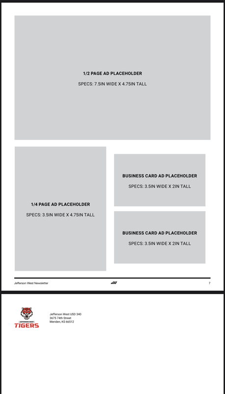 Meriden, Kansas - We heard from many of our local patrons that we would love an ongoing printed newsletter that provides an overview of Jeff West. With that input, we are excited to announce a new quarterly printed newsletter that delivers all the latest news on Jeff West! Ad space is limited and available, starting at $150 per issue. The ad space will help us cover our postage and printing cost in making this newsletter available to all Jefferson West School District patrons! Any ad revenues received in excess of our printing and mailing costs will be applied to our Family Friday's Campaign, supporting students and staff in celebrating everything that makes the Jeff West Family special. If you would like to have an ad in the first edition, please call (785) 484-3444 or email jason.crawford@usd340.org. #LearnYourStripes #HeedTheRoar